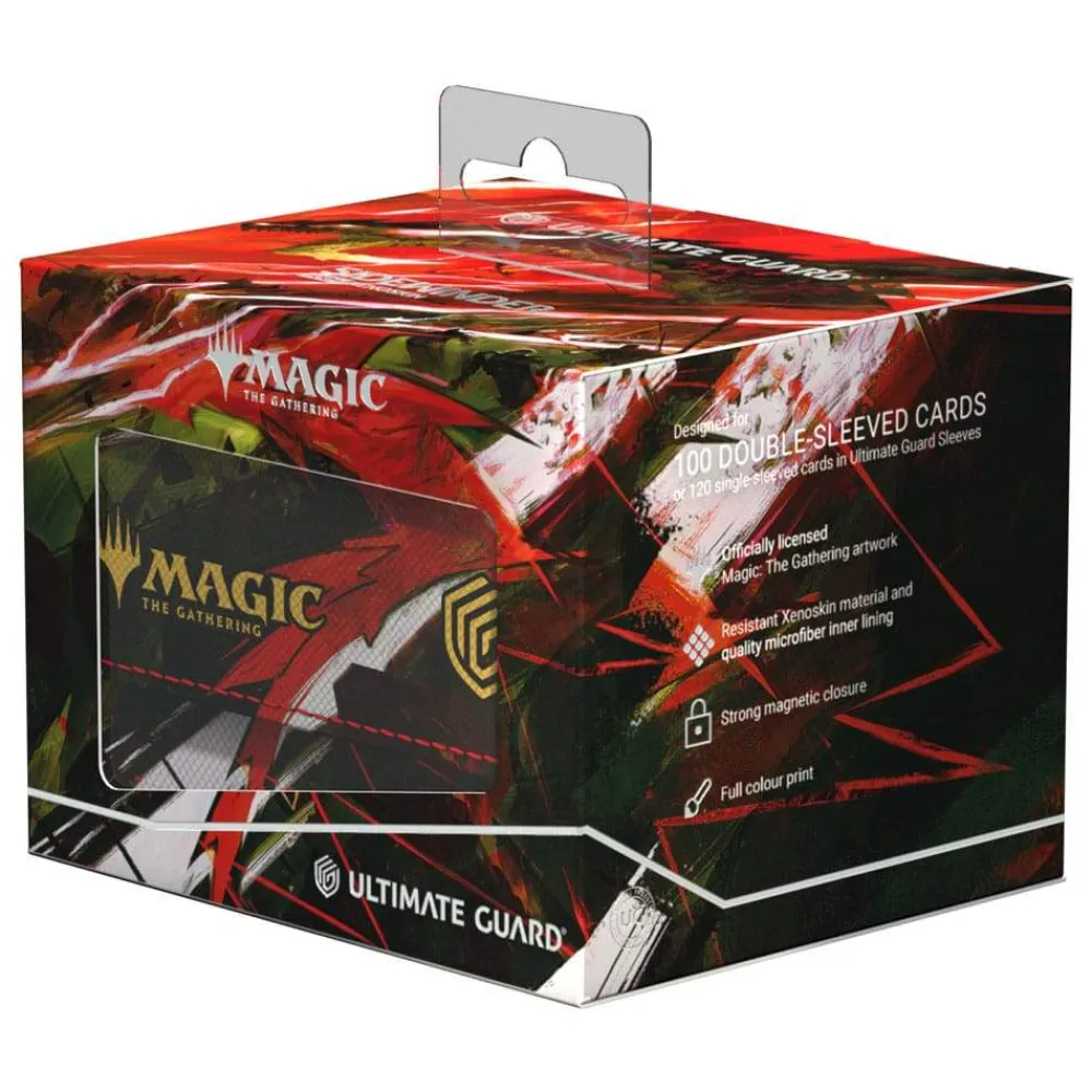 The Sidewinder 100+ made from durable Xenoskin material holds up to 100 double-sleeved or 120 single-sleeved cards, which are kept secure in the deck box thanks to a strong magnetic closure and soft microfiber interior. The sturdy, high-quality Xenoskin surface of the Sidewinder is printed in full color with officially licensed artwork from Magic: The Gathering’s Tarkir: Dragonstorm set.
