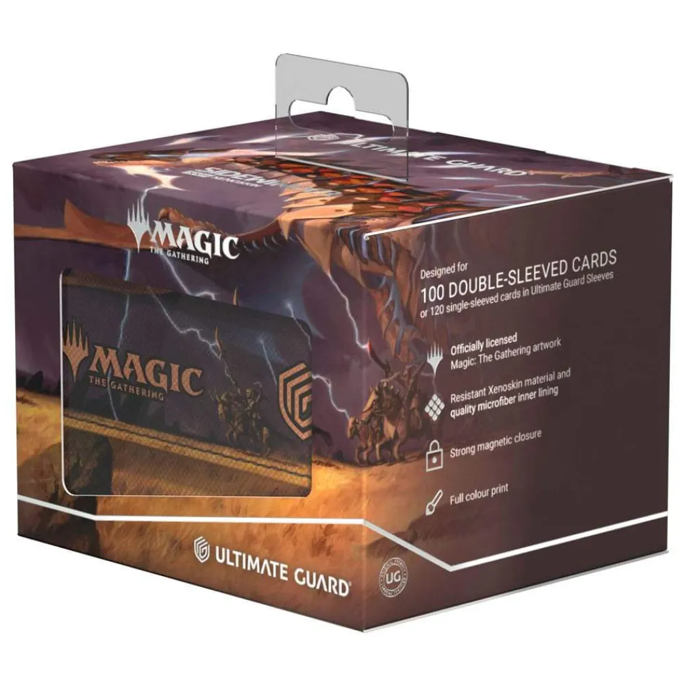 The Sidewinder 100+ made from durable Xenoskin material holds up to 100 double-sleeved or 120 single-sleeved cards, which are kept secure in the deck box thanks to a strong magnetic closure and soft microfiber interior. The sturdy, high-quality Xenoskin surface of the Sidewinder is printed in full color with officially licensed artwork from Magic: The Gathering’s Tarkir: Dragonstorm set.
