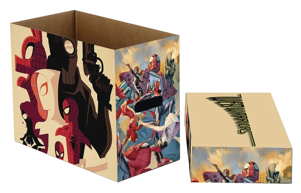 corrugated material with two-layer handles and bottom. Each comic book storage box holds approximately 150-175 bagged and boarded comics. Includes lid.