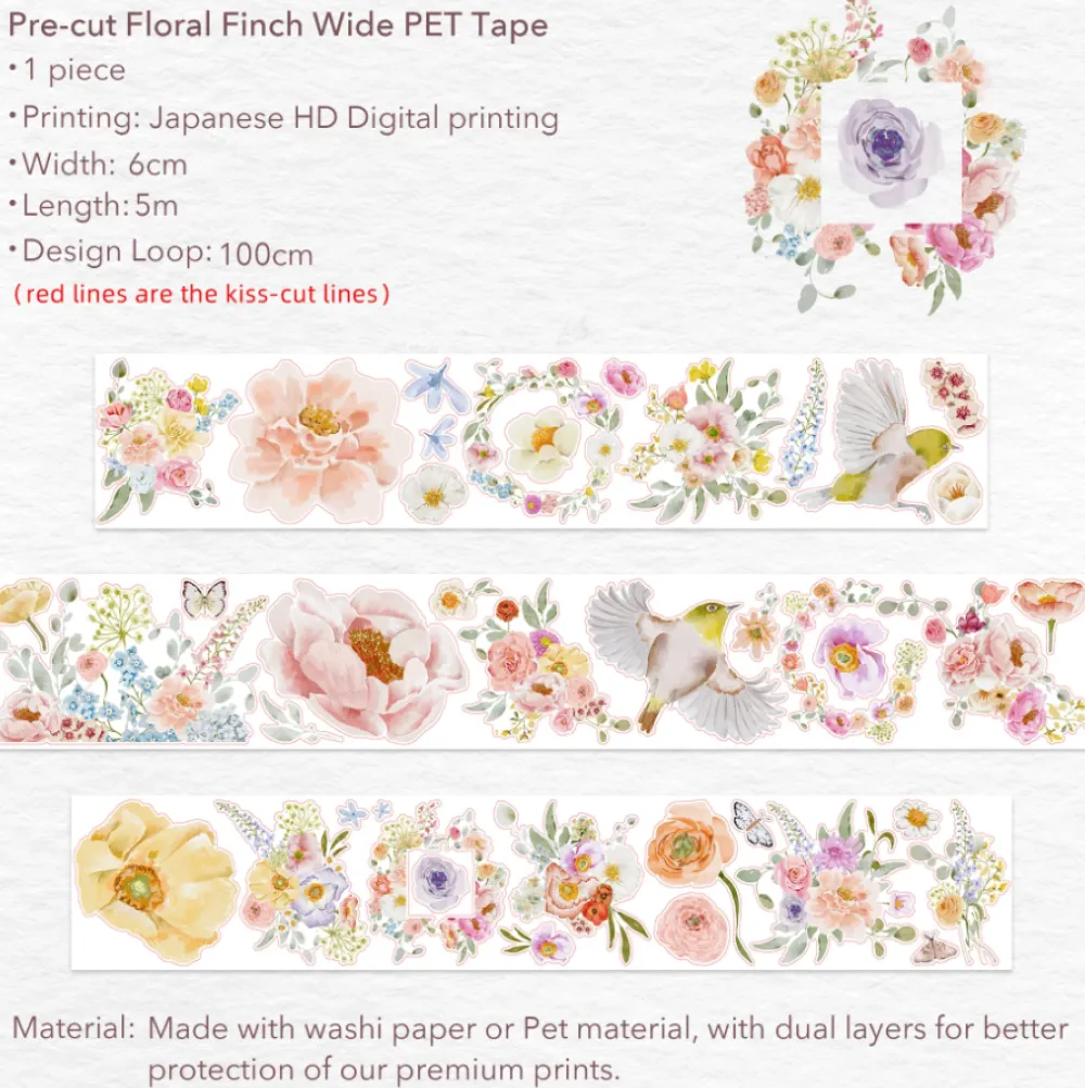 - Pre-cut Floral Finch Washi or PET Tape 60mm×5m
