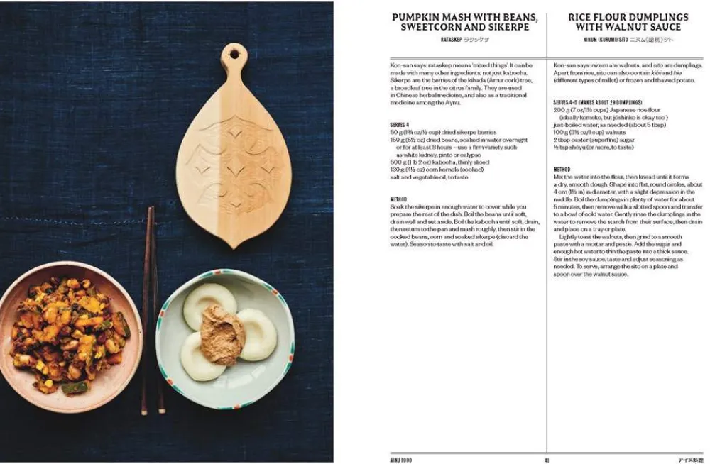 The recipes mostly fall into two categories: traditional, regional dishes and homages to specific dishes. There are also four Ainu recipes, which have been contributed by an Ainu chef, Hiroaki Kon.
