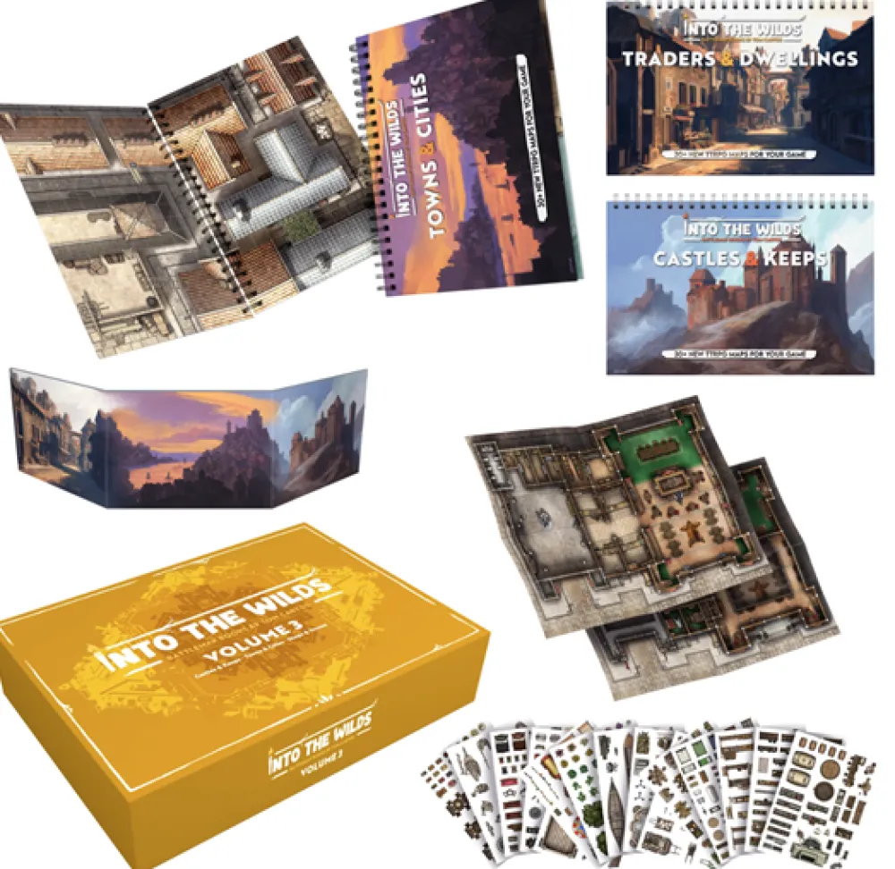 Into the Wilds is a collection of fully customizable, biome and region themed battlemap books for your favourite TTRPG. They are ideal for pre-set or random encounters, so you can be fully prepared no matter which direction your players choose to head in. The battlemaps come in two variations, a fully-furnished highly-detailed version with props and assets already placed for an extra level of immersion and story telling, and a second unfurnished version for you to customize however you need with the included re-usable asset stickers or that trusty dry-erase marker. The books are spiral bound so you won’t have to keep track of loose sheets flying everywhere, and the maps lay perfectly flat on your gaming table. The spirals are kept as small as possible, so they won’t get in the way of placing minis or props.