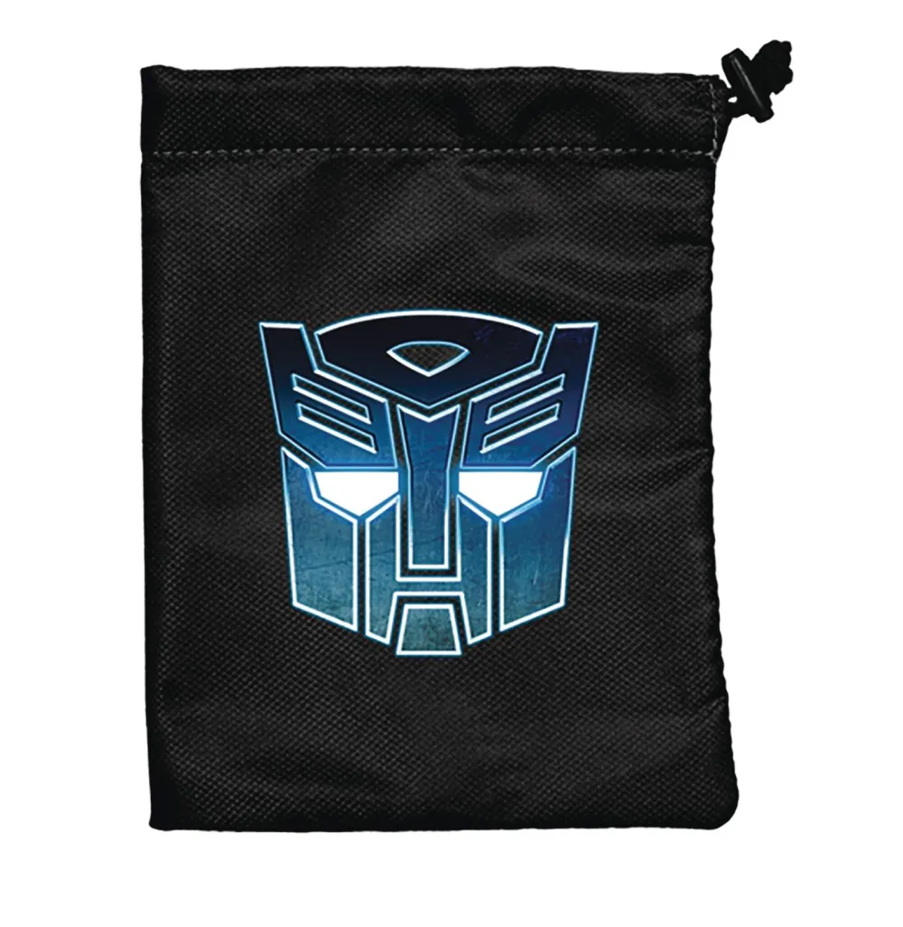 Keep your dice and other gaming accessories at hand in this premium quality Transformers Roleplaying Game dice bag! A sleek rendition of the classic Autobots symbol is featured on this dice bag, perfect for use while playing the Transformers Roleplaying Game! Featuring high quality construction with soft fabric exterior and protective liner, along with a locking drawstring clasp, your dice will be safe and secure. Measures 6.25 in x 8.5 in