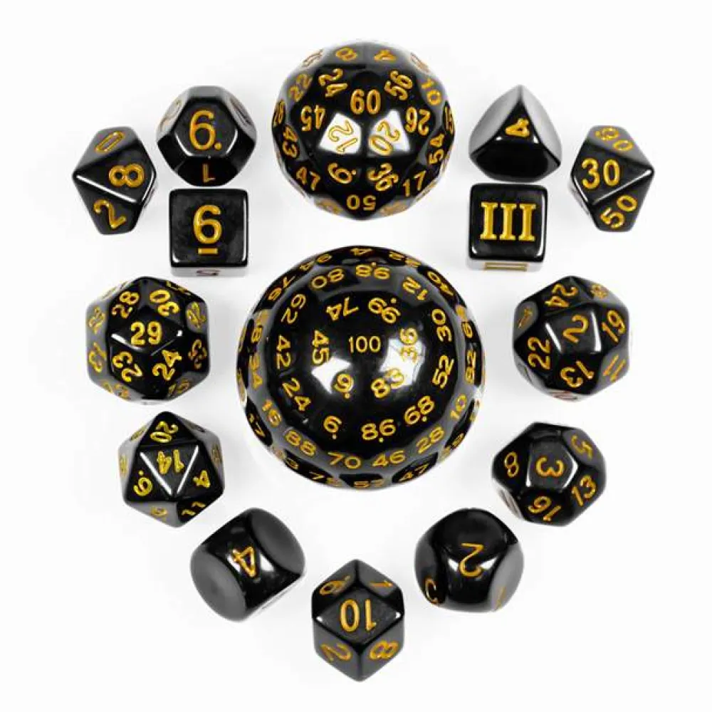 Et sett med femten forskjellige terninger, som passer til rollespill. Inkluderer: D3, D4, D5, D6, D7, D8, D10, D10 (prosentterning), D12, D16, D20, D24, D30 og D60.