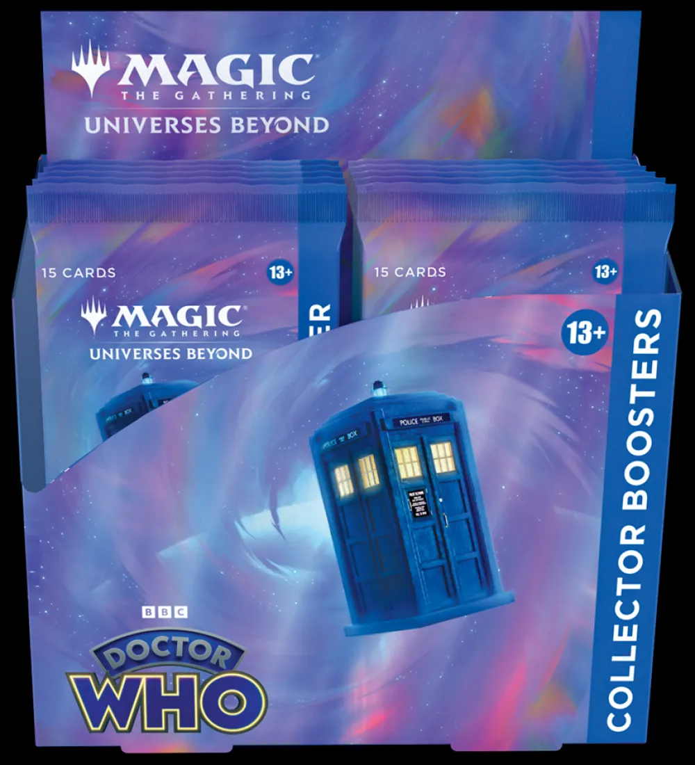 The Universes Beyond: Doctor Who™ Collector Booster Box contains 12 Universes Beyond: Doctor Who™ Collector Boosters. Each Collector Booster contains 15 Magic: The Gathering cards and 1 Traditional Foil double-sided token, with a combination of 7-14 cards of rarity Rare or higher and up to 7 Uncommon, 5 Common, and 1 Land cards. Every pack contains a total of 12 Foil cards.