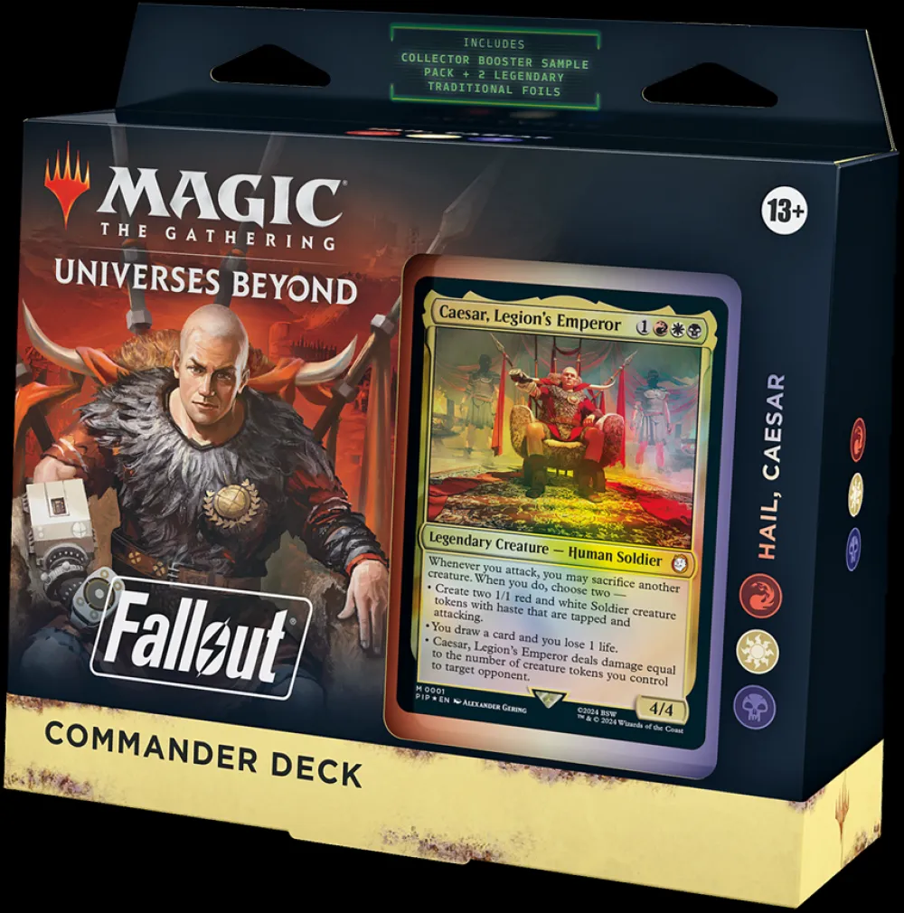 Battle your fellow wastelanders for survival as the Fallout series joins with Magic’s most popular multiplayer format. This bundle includes all 4 Fallout Commander Decks—1 Hail Caesar (Red-White-Black deck), 1 Scrappy Survivors (Red-Green-White deck), 1 Science! (Blue-White-Red deck), and 1 Mutant Menace (Black-Green-Blue deck). Each deck set includes 1 ready-to-play deck of 100 Magic cards (2 Traditional Foil Legendary cards, 98 nonfoil cards), a Collector Booster Sample Pack (contains 2 Traditional Foil or nonfoil special treatment cards, with 1 Extended-Art card of rarity Rare or higher and 1 alt-art, alt-frame card of rarity Uncommon or higher), 1 foil-etched Display Commander (a thick cardstock copy of the commander card with foil etched into the card’s border and art), 10 double-sided tokens, 1 deck box (can hold 100 sleeved cards), 1 Life Wheel, 1 strategy insert, and 1 reference card.