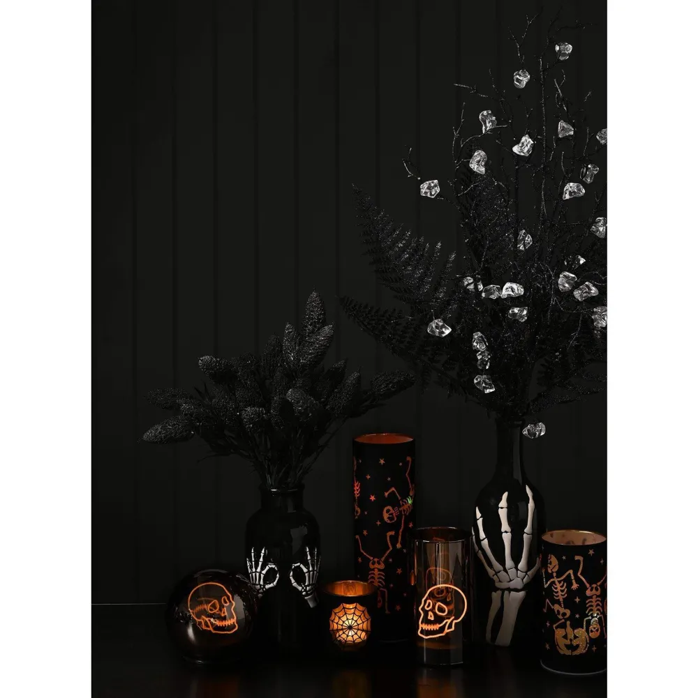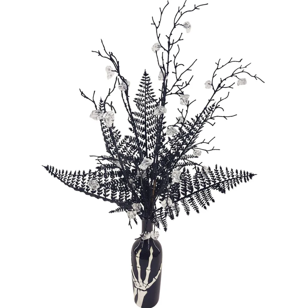 The artificial foliage creates a hauntingly beautiful display, enhanced by crystal embellishments that add a touch of eerie sparkle.
