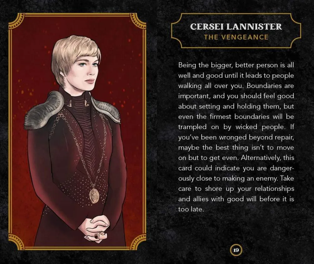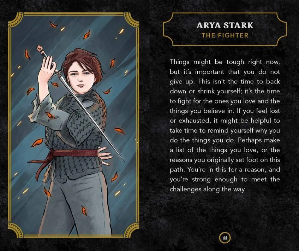 – Gorgeously illustrated: Each of the 40 cards in this oracle deck is vibrantly illustrated with original artwork; let The Iconoclast (Rhaenyra Targaryen) inspire you to break the mould or The Warrior (Brienne of Tarth) demonstrate humility and grace-these and many more characters in this one-of-a-kind set celebrate the women who inhabit the world of Game of Thrones and House of the Dragon.