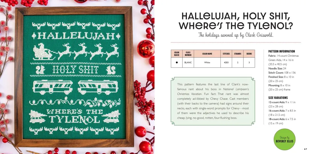 There is no previous experience required here! In addition to simple instructions and clear, easy-to-follow patterns, you get a basic lesson in cross-stitch technique, so anyone can make these designs. Stitch your stress away with a little “Hello Drunk, I’m Christmas” for your tree, or make a “Deck the Halls and Not Your Family” for your sibling.